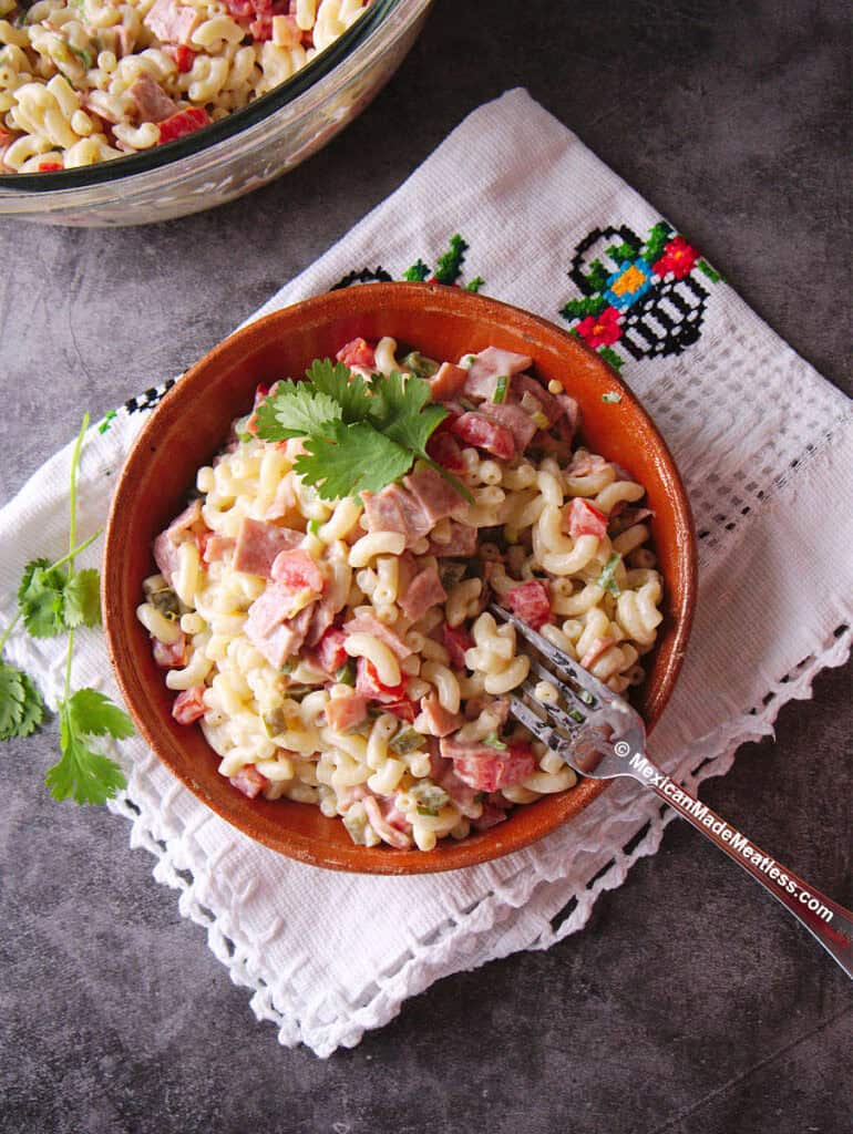 This salad puts a plant-based spin on a classic Mexican dish. Traditionally made with meat, egg-based mayo, and dairy-based crema, this version uses vegan ham, plant-based mayo, and a homemade non-dairy crema.